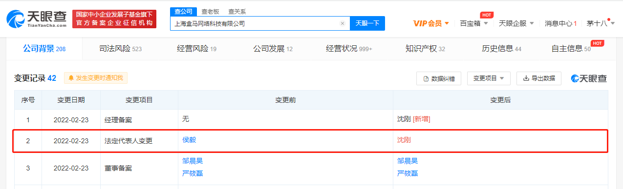 龙商网消息: 天眼查App显示,2月23日,上海盒马网络科技有限公司发生工商变更,法定代表人由侯毅变更为沈刚。该公司成立于2015年6月,注册资本约6.49亿人民币,经营范围含食品经营、酒类经营等。...