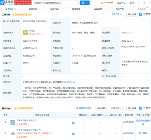 龙商网消息:企查查APP显示,无锡润宁供应链管理有限公司成立,法定代表人为朱元元,注册资本5000万元人民币,经营范围包含:供应链管理服务;移动通信设备销售;智能车载设备销售;智能无人飞行器销售等。企查查股权穿透显示,该公司由无锡丰润投资有限公司、苏宁易购(002024)共同持股。
