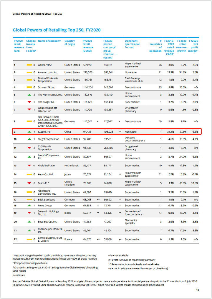 龙商网消息: 中国零售商首次排名进前十。 沃尔玛第一,京东飙升至第九,苏宁、阿里、永辉、华润万家等16家中国零售商上榜。 近日,德勤发布《2022全球零售力量》报告。该报告基于2020财年(2020年7月1日至2021年6月30日)的公开数据进行排名,统计出全球250...