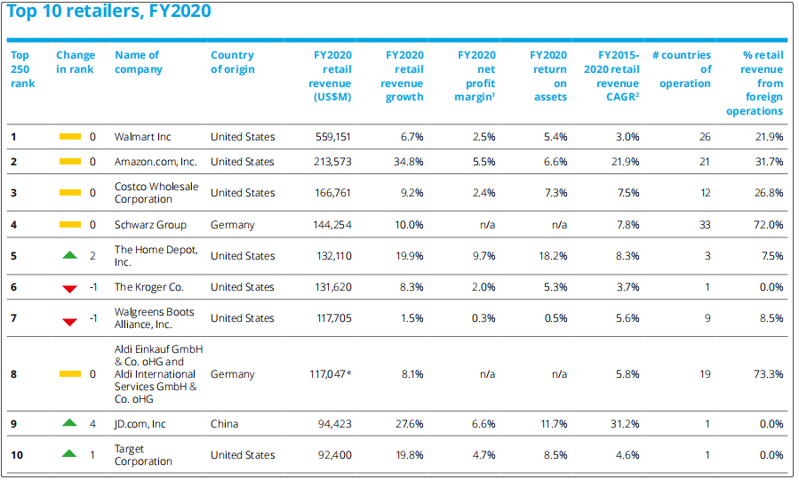 排名4-10位的依次是德国的折扣店施瓦茨集团,美国的家得宝集团,美国的克罗格集团,美国的沃博联集团,德国的奥乐齐集团,中国的京东集团,美国的塔吉特集团。