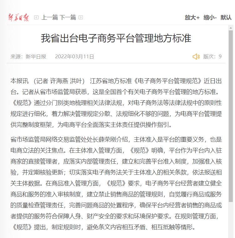 龙商网消息: 日前,江苏省地方标准《电子商务平台管理规范》近日出台。从江苏省市场监管局获悉,这是全国首个有关电子商务平台管理的地方标准。在主体准入管理方面,《规范》明确,平台作为平台内入驻商家的直接管理者,应落实内部管理责任,建立和完善平台...