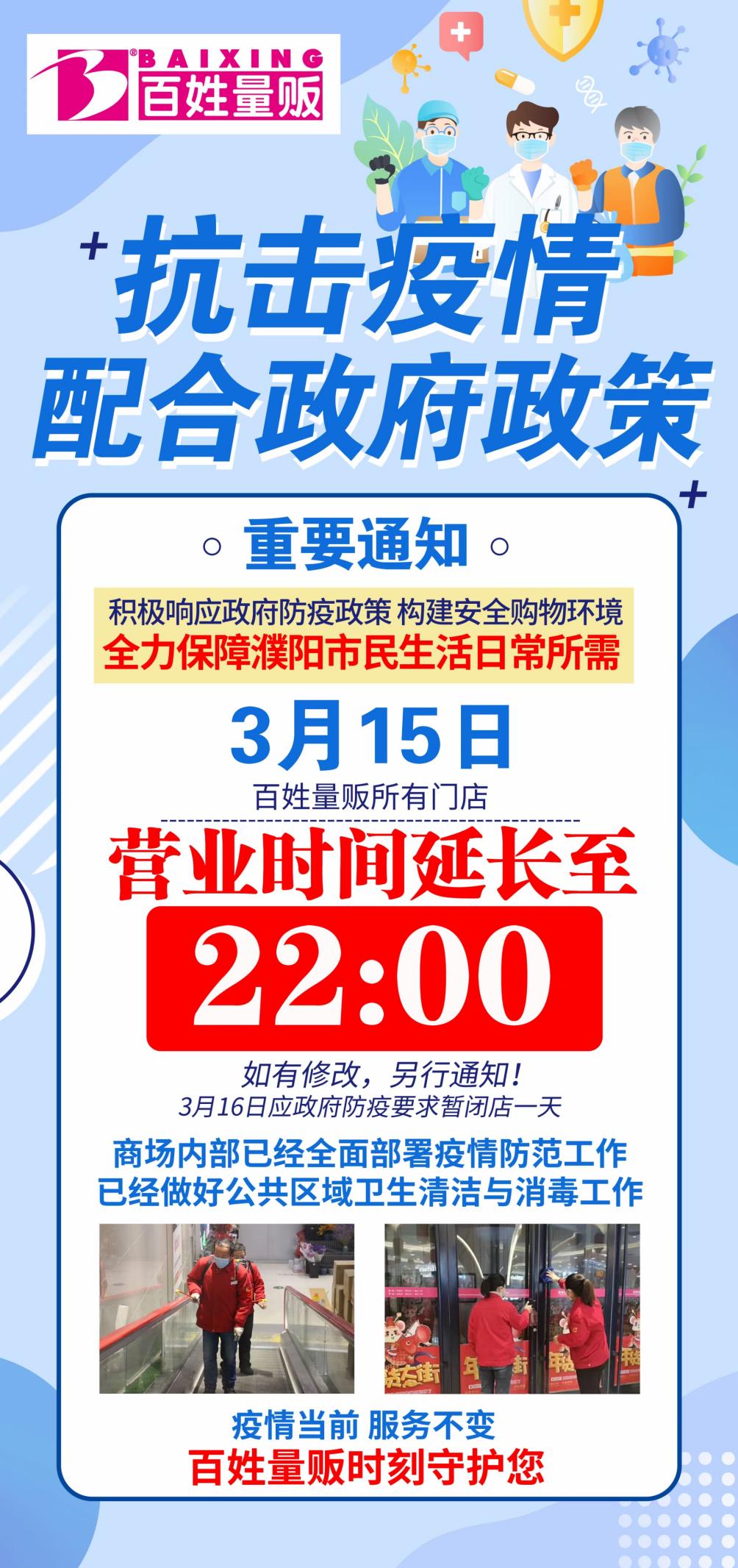 为配合当地疫情防控政策、进行新一轮核酸检测,濮阳绿城超市、濮阳百姓量贩超市3月15日延长营业时间,3月16日闭店一天。