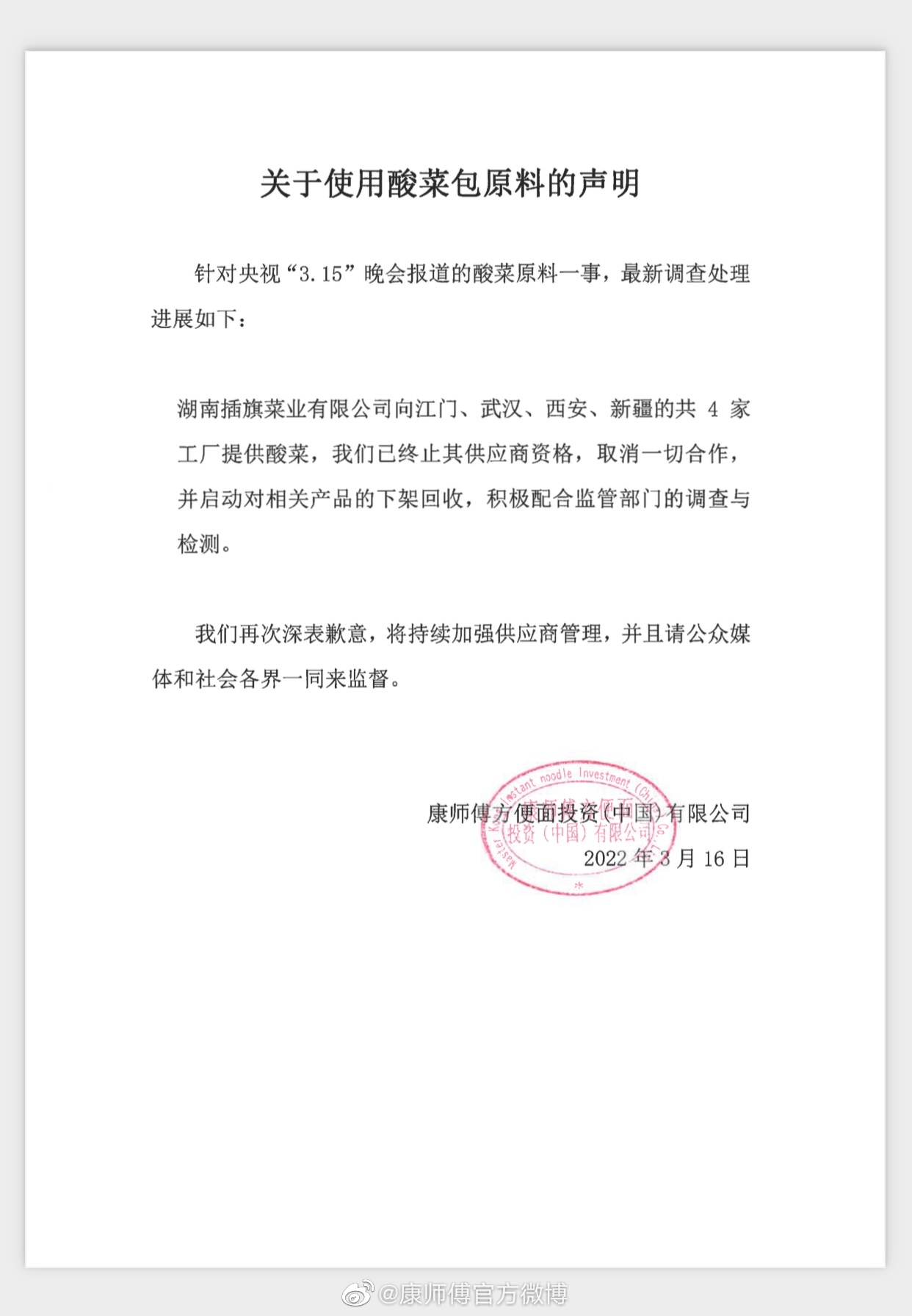 据康师傅官方微博,康师傅方便面投资(中国)有限公司再次发表关于使用酸菜包原料的声明。针对央视“3.15”晚会报道的酸菜原料一事,发布最新调查处理进展。声明称,湖南插旗菜业有限公司向江门、武汉、西安、新疆的共4家工厂提供酸菜,我们已终止其供应商资格,取消一切合作,并启动对相关产品的下架回收,积极配合监管部门的调查与检测。