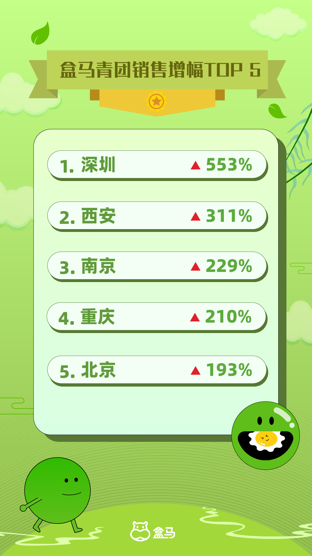 今年2月中旬盒马启动青团季,截至目前,深圳、西安、南京、重庆、北京是青团销售额增幅TOP5,增幅最大的深圳、西安,比去年同期增长了553%、311%。足见江浙沪以外区域消费者对青团的热情。