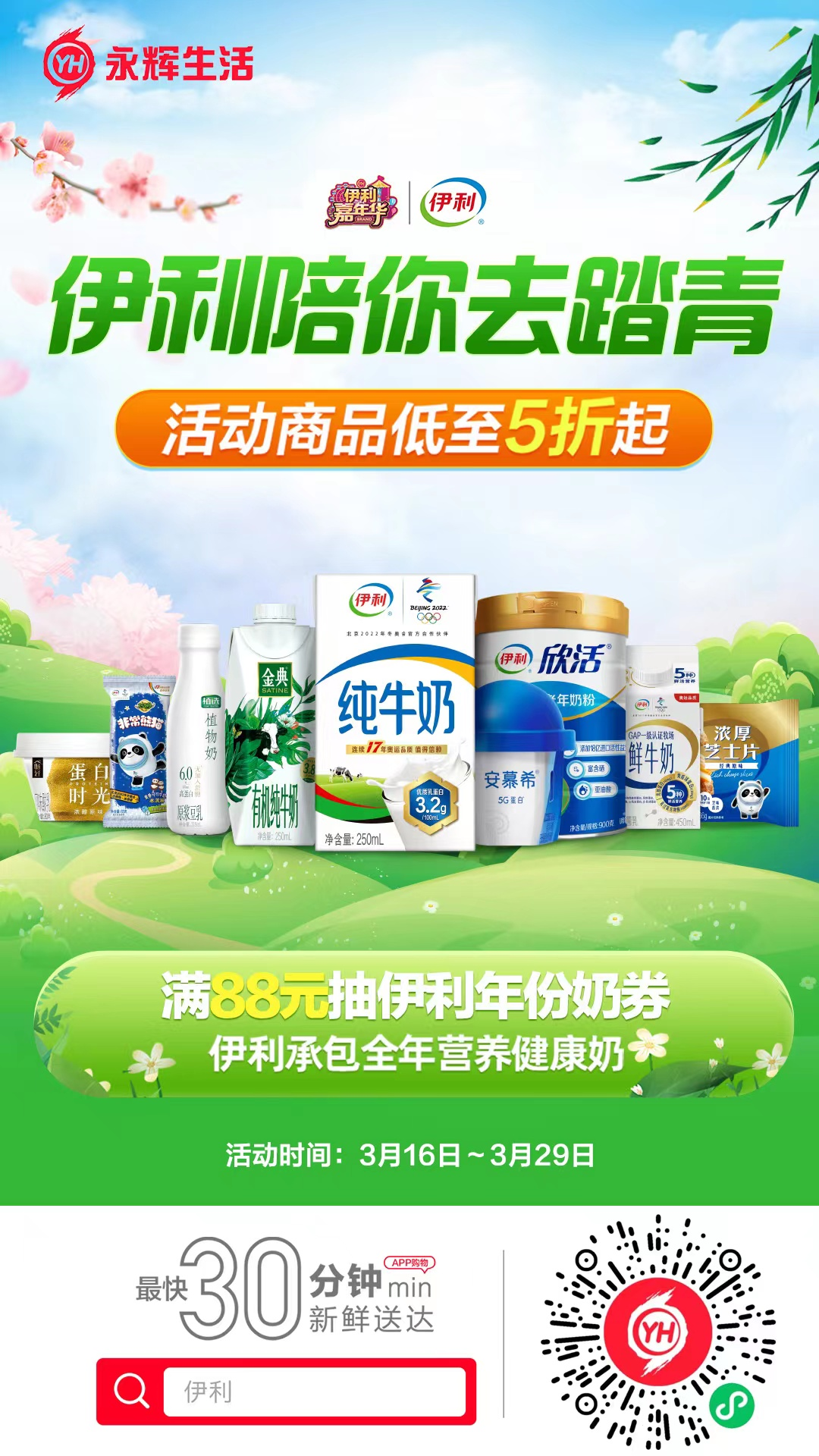 此次活动时间持续两个星期,由3月16日至3月29日止,活动范围为永辉在全国的1040家门店及永辉生活小程序和APP。活动期间,在永辉线下门店购买伊利全品可获得99-20元优惠,购买纳爱斯产品能获得线下商品低至五折起的优惠。在此之外,永辉生活小程序及APP也提供线上购物的专属优惠。