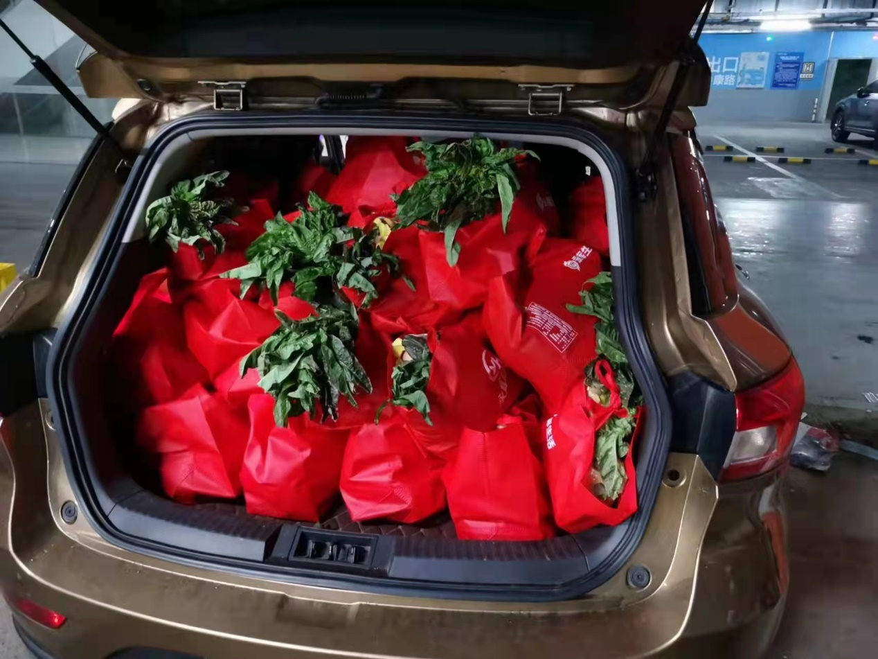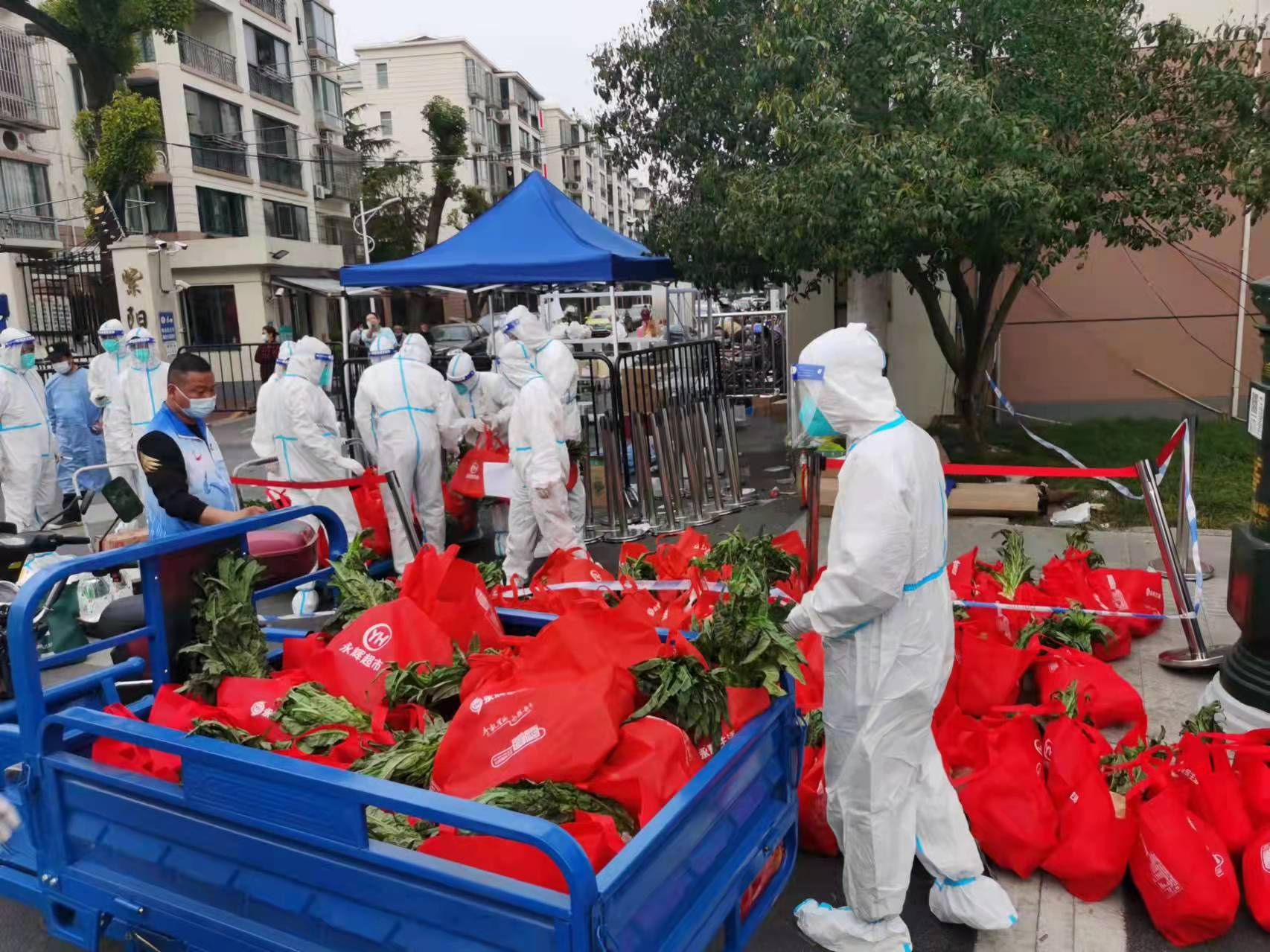 3月23日,居住于上海市浦江镇的居民发现,社区里出现了一袋袋装满蔬菜、肉类、鸡蛋等物资的红袋子,无纺布包装的袋子上印着“永辉生活”。鲜鸡蛋、菠菜、西红柿、白萝卜等被上海市民戏称为“疫情中的奢侈品”的保供物资成袋进入浦江镇的小区中。