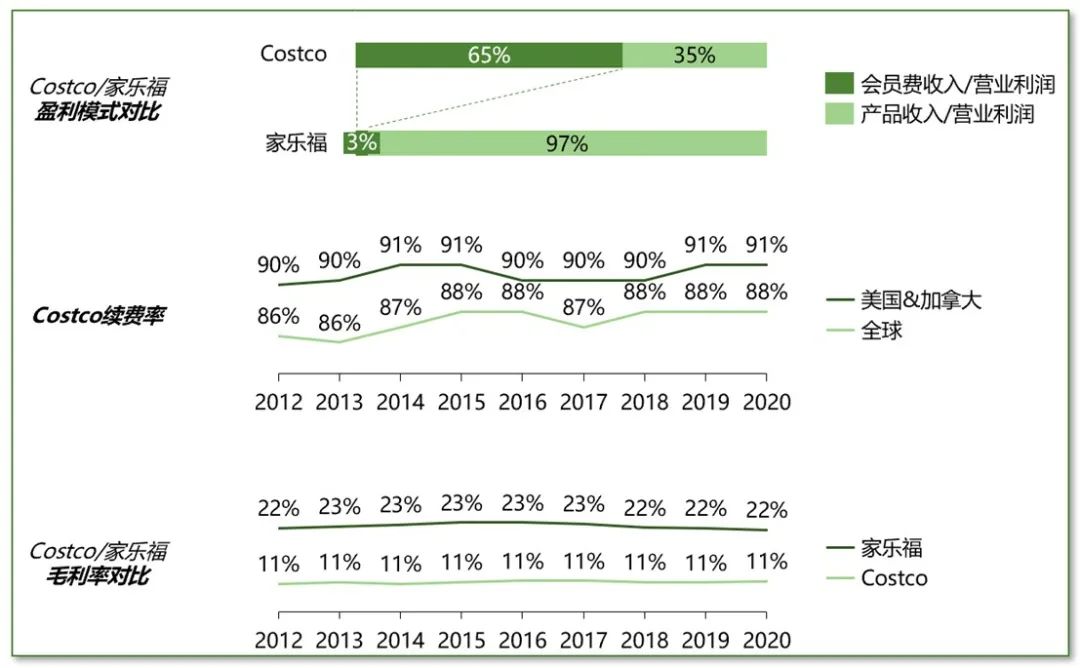 说到会员店,有意思的是,无论全球最大的Costco还是德国最大的Aldi均被戏称“穷人超市”。这当然是消费者的调侃,Costco几乎覆盖全美绝大多数家庭,全球超过1亿的会员数(~45%是附属卡,活跃付费数~6,200万)和~90%的会员续费率。Costco在几十年前就上市了,分析其模式的文章不少,这里不展开。