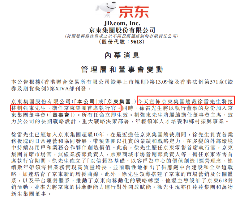 龙商网消息:今日(4月7日),京东集团宣布总裁徐雷将接替刘强东,担任京东集团首席执行官。同时,徐雷先生将以执行董事的身份加入京东集团董事会。所有任命立即生效。