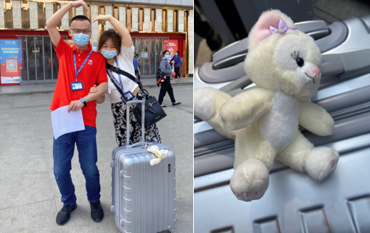 特别值得一提的是,薛贝和爱人均为家乐福员工,在2020年武汉疫情期间两人也是第一时间奋不顾身投入到门店一线。还记得当年那个隔着窗户喊妈妈的女孩吗?还记得当年每日每夜的工作,只能在下班时到楼下远远和孩子凝望期待团圆的眼神吗?小女孩甜甜这一次也特别为爸爸驰援上海做了很多准备,在出门前特别在爸爸行李箱上挂上她最喜爱的玩偶,嘱咐爸爸“加油!平安归来”。