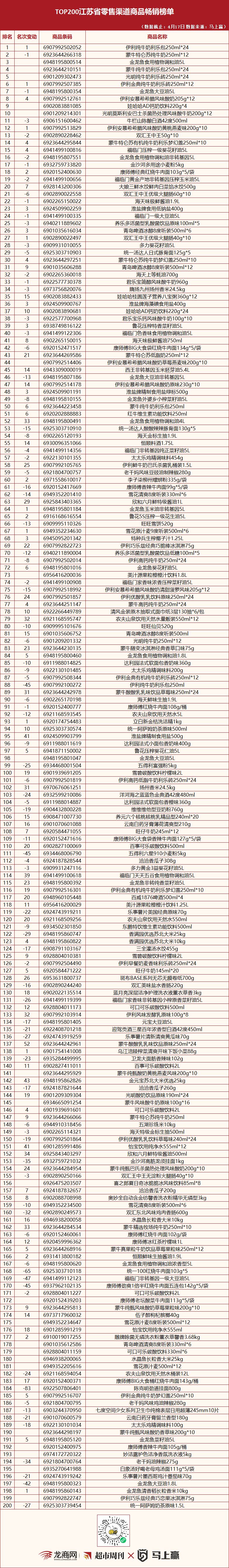 “TOP200河南、江苏省零售渠道商品畅销榜单”发布(3月28日版)