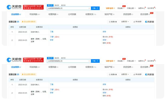 据报道,天眼查App显示,4月25日,北京网易传媒有限公司信息显示,丁磊退出法定代表人及总经理、董事职务,由网易传媒CEO李黎接任。网易内部人士称:“这是正常工商变更。”据了解,网易传媒为网易旗下“网易新闻”的主体公司。