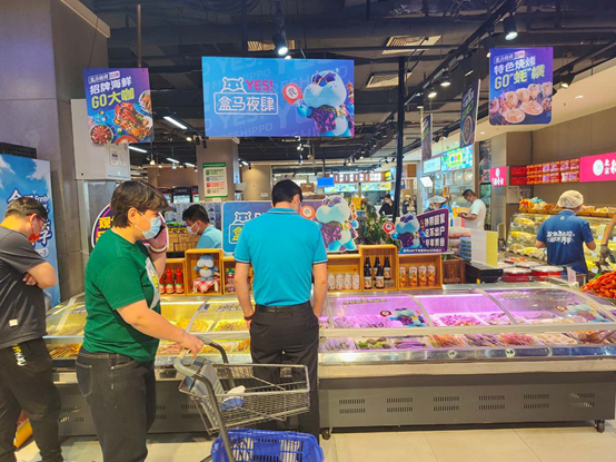 盒马遵守相关规定店内已经取消了堂食。但记者发现自提的顾客不在少数,店内拣货、配送等环节依然火爆。“很多顾客选择线上配送,在家也能享受到美食。”一位盒马店员介绍。
