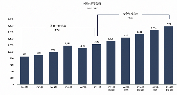百果园对水果生鲜的未来持续看好。其在招股书中引用咨询机构弗若斯特沙利文的数据称,中国水果零售市场的市场规模已由2016年的8273亿元增加至2021年的12290亿元,复合年增长率约为8.2%。预计2021年至2026年,中国水果零售市场的市场规模预期复合年增长率为7.6%。