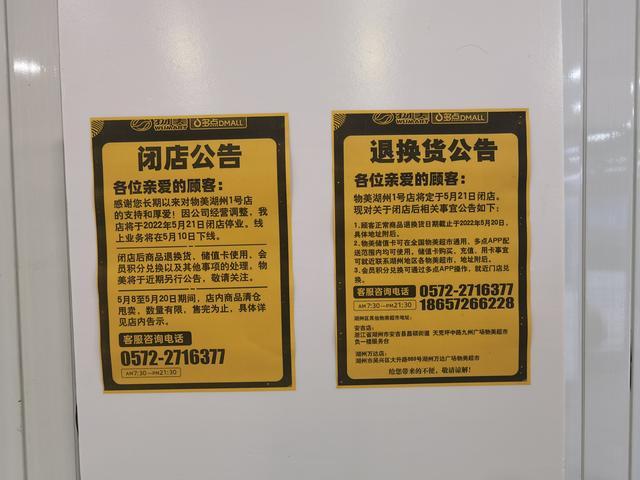 龙商网消息: 5月7日,物美集团发布闭店公告,因公司经营调整,物美超市湖州1号店将于5月21日闭店停业,线上业务于5月10日下线。