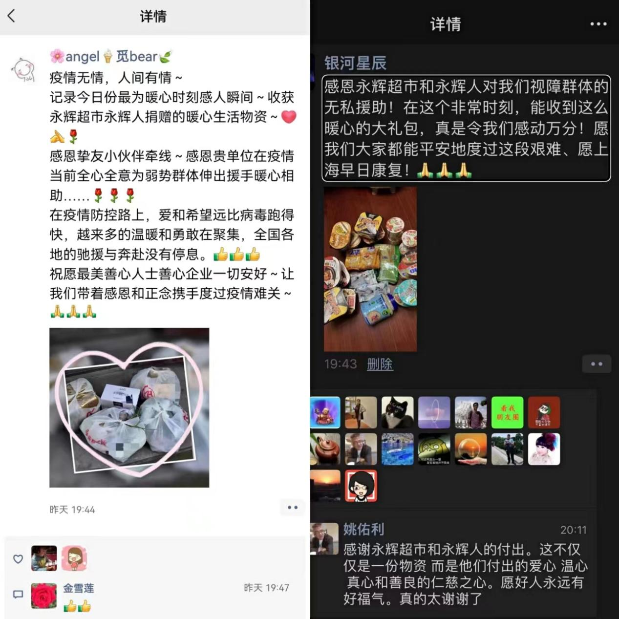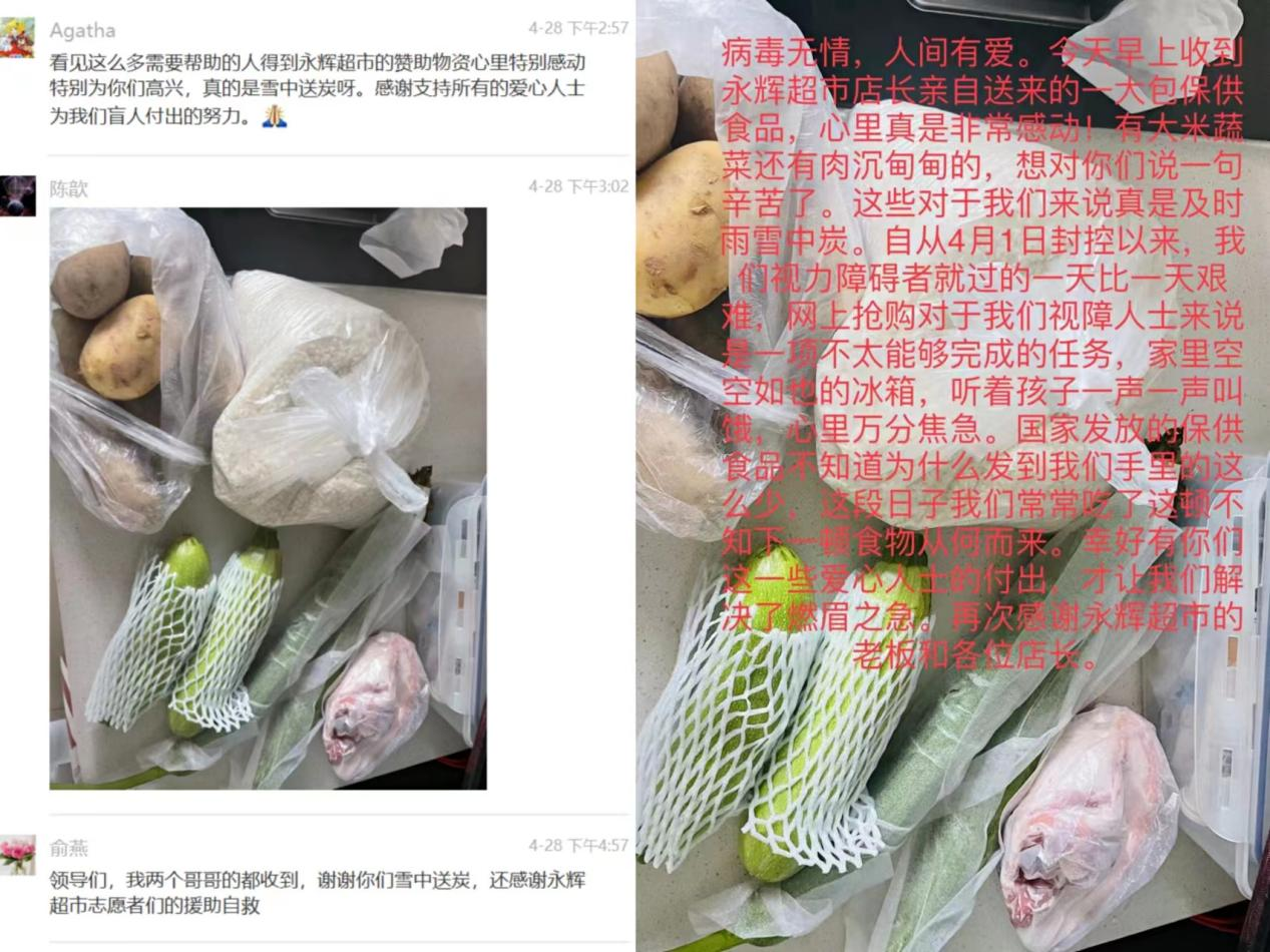 截至2022年5月7日,永辉已为上海54户视障人士家庭捐赠生鲜蔬菜食品等爱心物资,共计帮助119人视障人士。不少人在网络上表达了对永辉的感谢。