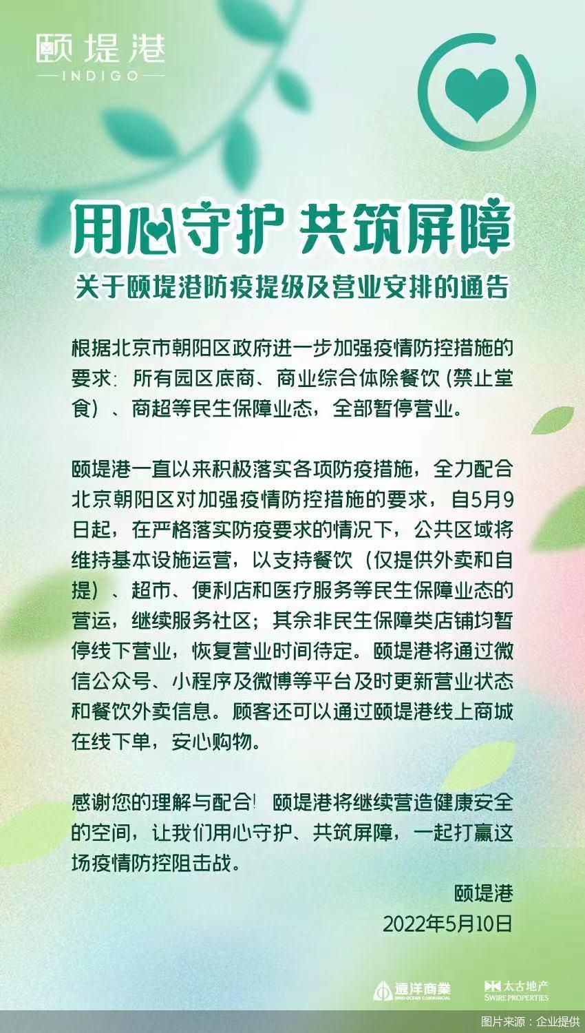 据悉,北京市朝阳区政府进一步加强疫情防控措施的要求:所有园区底商、商业综合体除餐饮(禁止堂食)、商超等民生保障业态,全部暂停营业。
