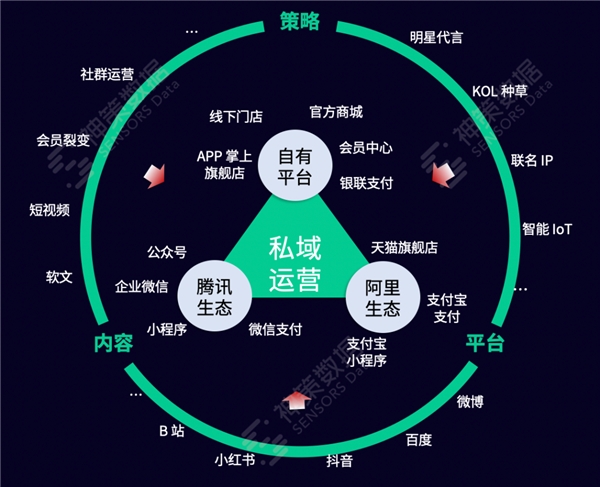 私域运营:以自有平台(线上 + 线下)为主,利用微信生态与小程序商城的无缝对接,以及支付宝与天猫旗舰店,对消费者进行多触点触达,形成持续的消费者连接、内容传递和销售转化的闭环。