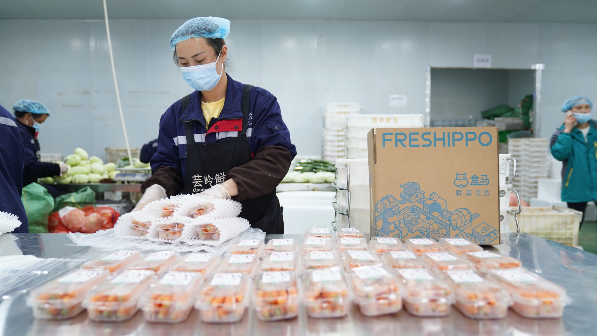 (图:盒马村蔬菜加工车间,产业工人正在给蔬菜打包)