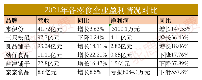 截至目前,包括三只松鼠、良品铺子、劲仔食品、盐津铺子、亲亲食品等零食企业已经尽数发完2021年财报。