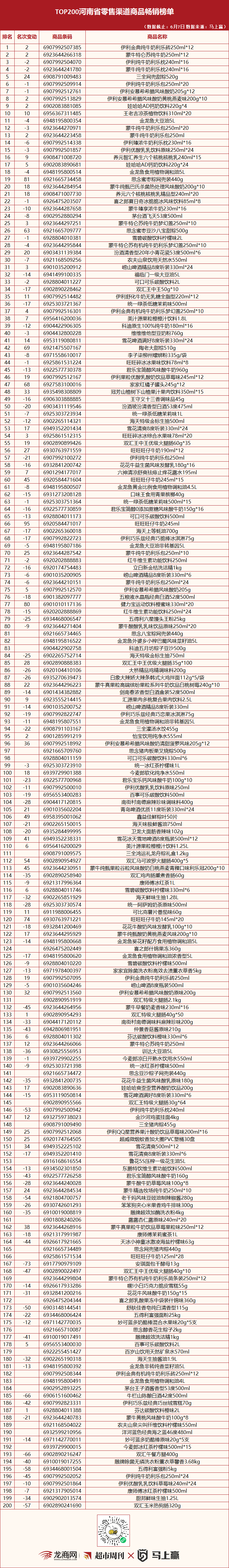 “TOP200河南省零售渠道商品畅销榜单”发布(3月6日版)