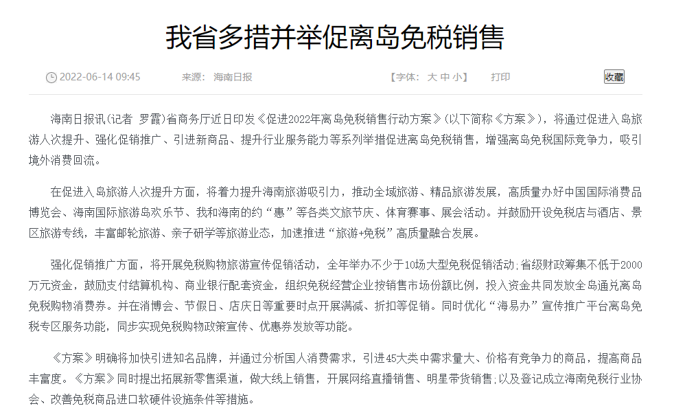 龙商网消息:海南省商务厅近日印发《促进2022年离岛免税销售行动方案》,将通过促进入岛旅游人次提升、强化促销推广、引进新商品、提升行业服务能力等系列举措促进离岛免税销售,增强离岛免税国际竞争力,吸引境外消费回流。《方案》提出,鼓励开设免税店与酒店、景区旅游专线,丰富邮轮旅游、亲子研学等旅游业态,加速推进“旅游+免税”高质量融合发展。