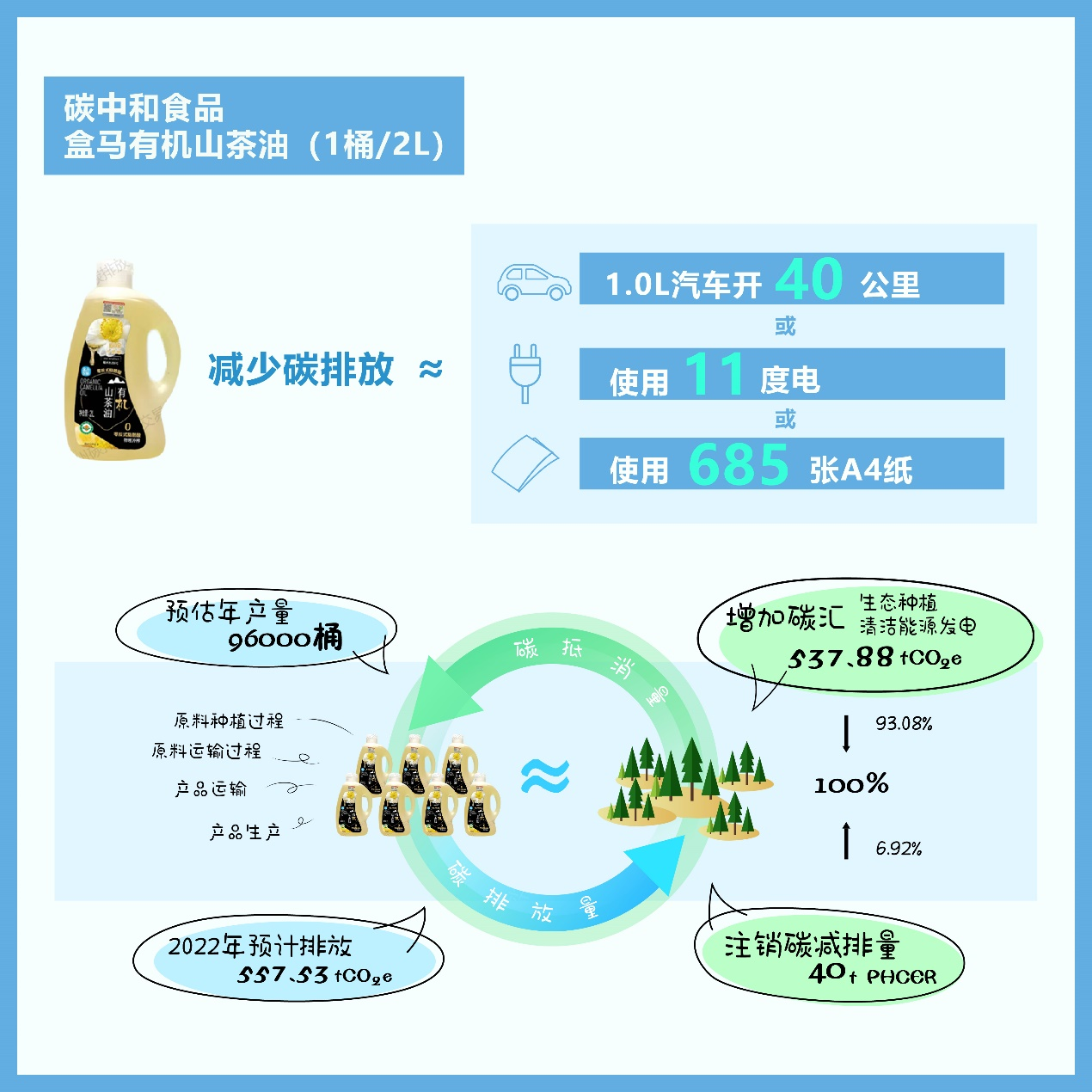 广州碳排放权交易所的信息披露显示,该批盒马有机山茶油(2L装)共计约96000桶,生产期间的总碳排放量预计为577.53tCO2e,预估碳汇增量为537.888 tCO2e,同时注销广东省碳普惠制核证减排量为40tPHCER,两者之和大于生产总碳排放量,实现产品预先碳中和。