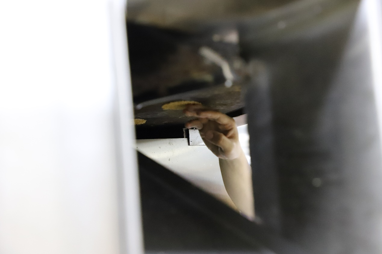 第一步就是把烧饼“瘦身”。“周村烧饼通常直径是7.5厘米到13.5厘米之间,放进酸奶盒要把直径控制在5厘米。” 山东周村烧饼有限公司副总经理、非遗传承人张俊杰说,越小尺寸对纯手工做饼的师傅要求越高。