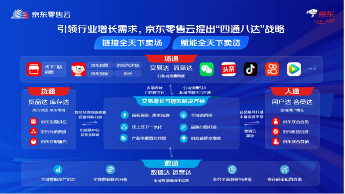 “四通八达”战略的核心,是将京东在过去19年中积累的技术能力、业务能力以及供应链资源与广大泛零售合作伙伴在“人、货、场、数”中分别打通,实现用户达、会员达、货品达、库存达、交易达、流量达、数据达、运营达,进而帮助企业通过数字化转型实现交易增长与提效。