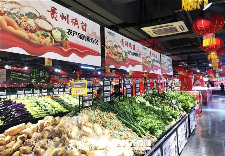 合力惠民生鲜超市内,贵州扶贫农产品消费专区摆满了各种生鲜果蔬