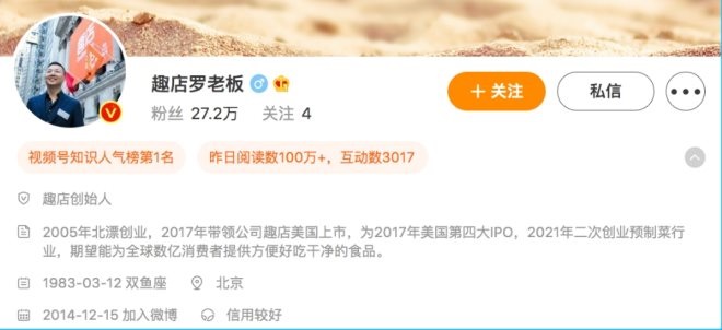 有媒体注意到,在罗敏的个人微博“趣店罗老板”的简介中,其将预制菜视作自己的“二次创业”,只字不提此前试水的项目。有人将此解读为:罗敏对预制菜项目格外重视。