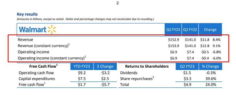 二季度,沃尔玛合并营业收入为69亿美元,下降6.8%,受到沃尔玛智利保险结算的1.73亿美元的积极影响。公认会计原则每股收益为1.88美元;调整后的每股收益2为1.77美元。包括沃尔玛智利保险结算产生的0.05美元影响;包括与公司在京东的股权投资相关的股息带来的0.05美元影响。