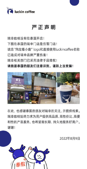 瑞幸官方发布微博声明,瑞幸咖啡并没有在泰国开过店,泰国的瑞幸门店为仿冒门店。该店“向左看小鹿”logo和直接使用luckincoffee名称已经对瑞幸品牌造成严重伤害,瑞幸相关部门已采用法律手段维权。