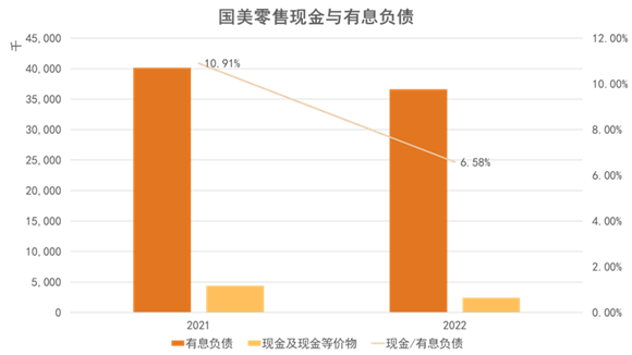 国美零售在2021年中和2022年中的有息负债规模(包括应付票据、长期和短期的计息银行及其他借款、衍生金融负债等科目数额之和)分别为401亿和366亿,在本报告期用现金偿还债务以后,货币资金与有息负债的比例从10.91%下降到6.58%。