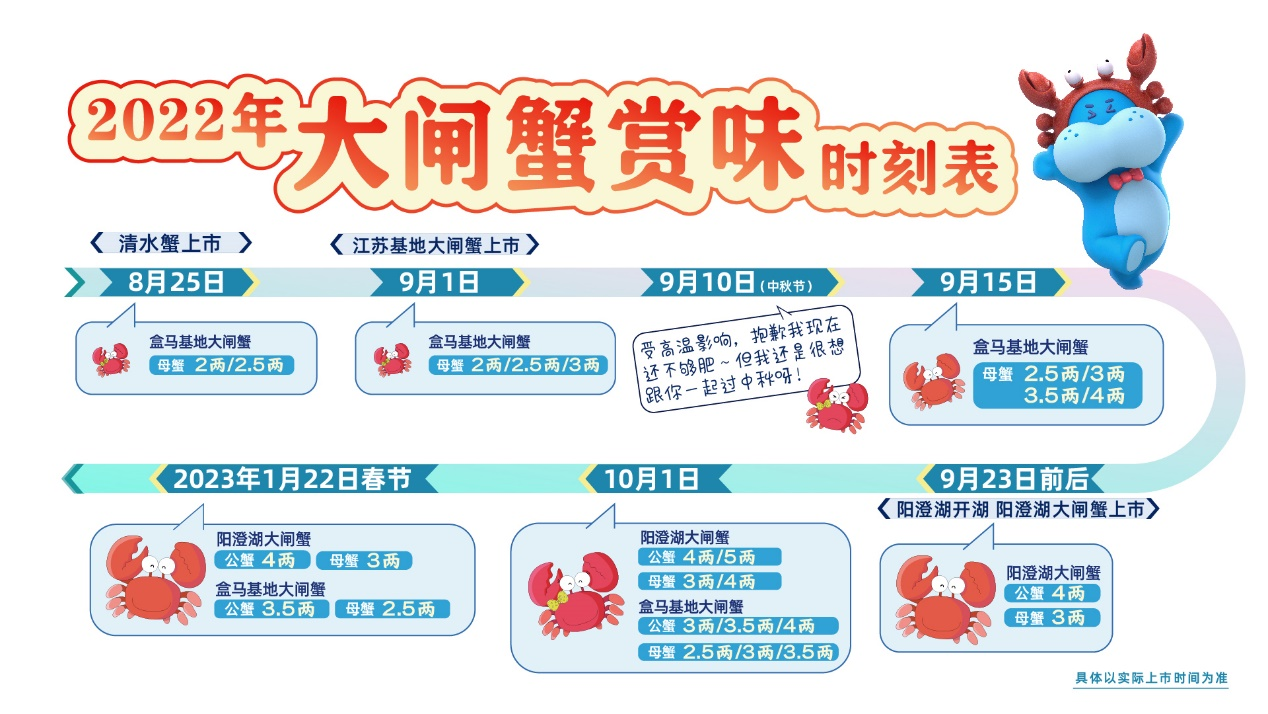 同时,盒马还发布了一份《2022年大闸蟹赏味时刻表》,为心急难耐的顾客呈现了一份清晰的吃蟹指南:国庆前后,更多产区和更大规格的公蟹母蟹会大量上市,目前还是以2-3两的蟹为主。