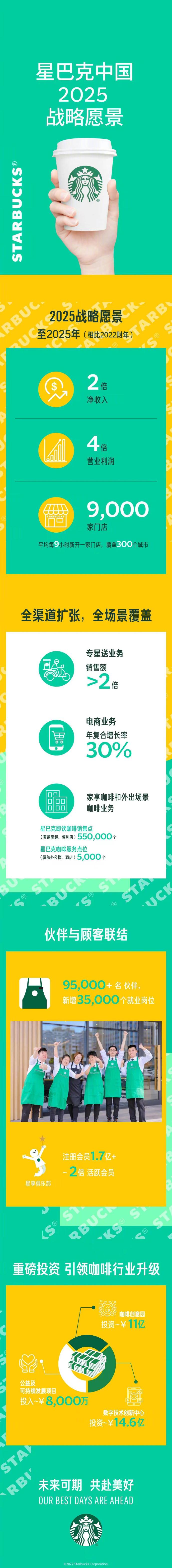 9月14日,星巴克中国官方微博发布了2025中国战略愿景,推出以价值为导向的全新增长计划,重磅加码中国市场。未来三年,星巴克中国将通过六大增长引擎,多项重大投资,加快推进公司发展势能。至2025年,星巴克中国总门店数量将达到9,000家,伙伴(员工)将新增35,000 人,达到95,000多名,并实现净收入翻倍,营业利润为当前四倍的增长目标。过去十年,星巴克中国内地门店数增长了近10倍,即将在2022财年底达到6,000家。公司计划至2025年,以平均每9小时开出一家新门店的速度,新增开3,000家门店,覆盖中国300个城市。预计至2025年,在全国开出约2,500家绿色门店,深入践行品牌的可持续发展理念。当前,每天有超过5,000名专属骑手,平均用时仅19分钟就可以把星巴克品质如一的咖啡送到门店外的顾客手中。