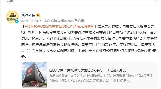 据港交所数据,国美零售大股东黄光裕、杜鹃、恒海投资有限公司和国美管理有限公司在9月14日减持了约27.37亿股,合计约5.31亿港元。