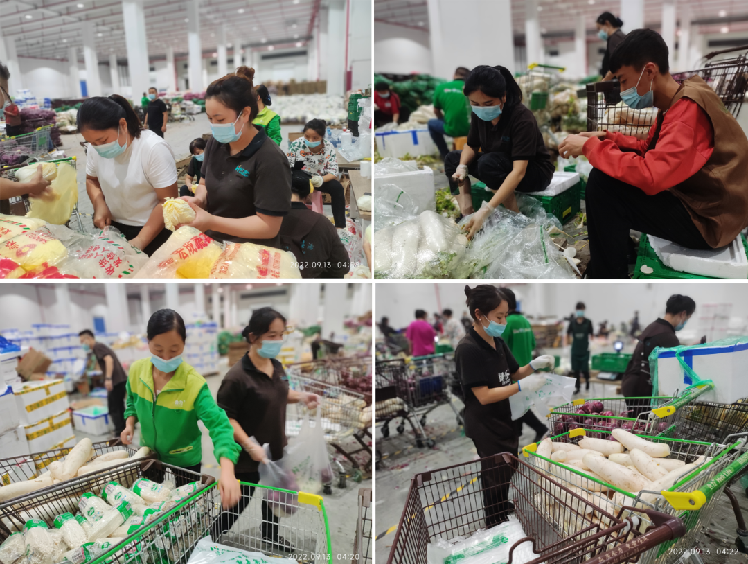 9月12日,各门店订单激增,保供中心扛下了40000个保供套餐包的任务。整个保供小组从9月12日清晨7点开始流水线作业,制作保供套餐包一直到9月13日早晨9点,连续工作26小时!圆满完成任务!