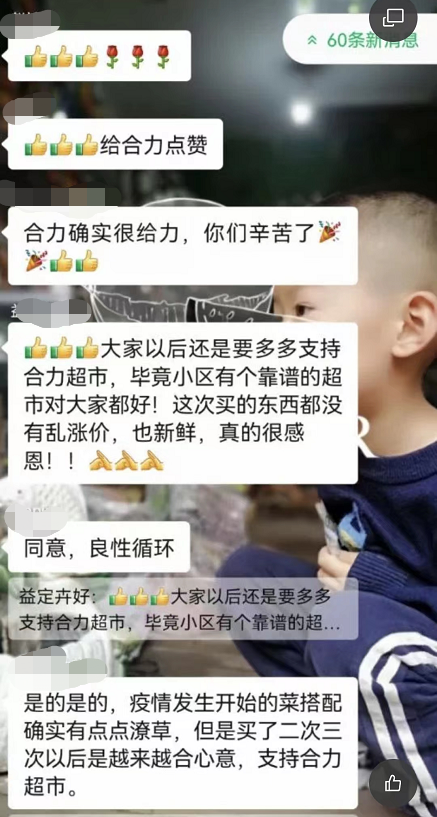 “陈经理,谢谢你,我们小区居民终于收到蔬菜包了,大家反馈品质好,价格实惠,真的非常感谢你们,感谢合力超市……”
