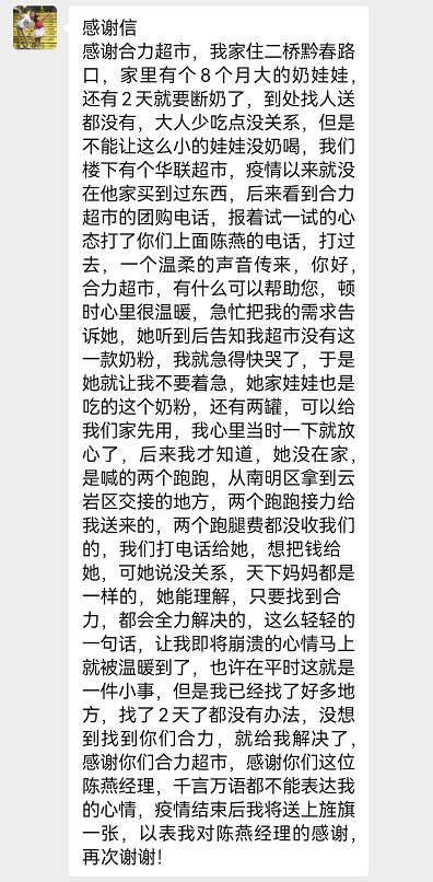 “特殊时期,每一份物资都弥足珍贵,更别说,对于年纪尚小的孩子。我当时真的找了所有我能找到的地方,找了2天了都没有买到奶粉,没想到找到你们合力,就给我解决了,感谢你们合力超市,感谢你们这位陈燕经理,千言万语都不能表达我的心情,疫情结束后我将送上旌旗一张,以表我对陈燕经理的感谢,再次谢谢!”