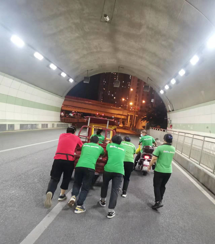 三轮车送货送到没电,全员下车推行上坡