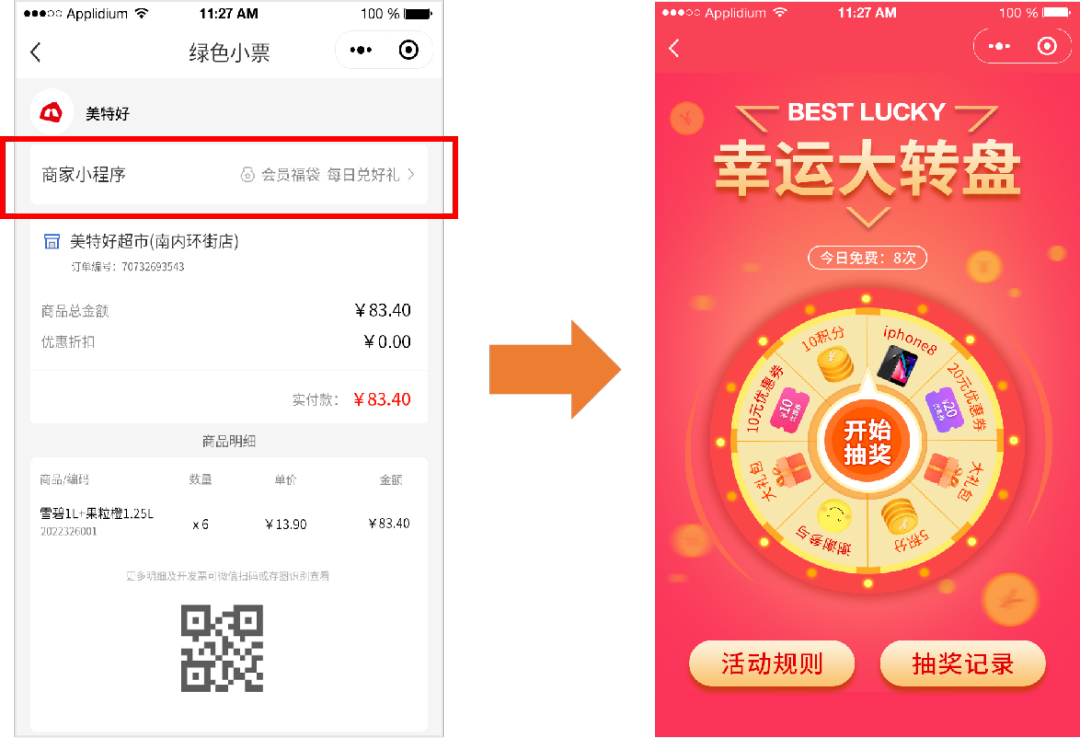 3.便于私域营销场景串联,为企业对消费者开展创新营销、服务拓展了新的天然场景互动口径,如:小票抽奖、低碳集点兑换等。