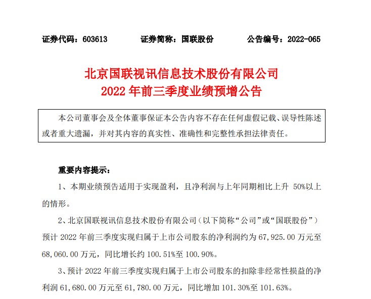 龙商网消息: 国联股份日前发公告称,经财务部门初步测算,预计2022年前三季度实现归属于上市公司股东的净利润为67,925.00万元至68,060.00万元,与上年同期相比,将增加34,048.08万元到34,183.08万元,同比增长约100.51%至100.90%。公告显示,上年同期国联股...
