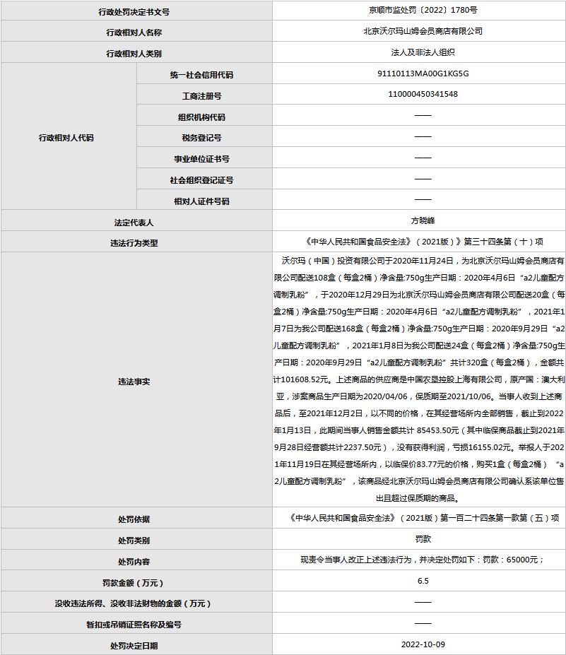 据悉,沃尔玛(中国)投资有限公司于2020年11月至2021年1月为当事人多次配送“a2儿童配方调制乳粉”,当事人在其经营场所内全部销售。举报人于2021年11月19日以临保价购买1盒(每盒2桶)“a2儿童配方调制乳粉”,经北京沃尔玛山姆会员商店有限公司确认,该商品系该单位售出且超过保质期。