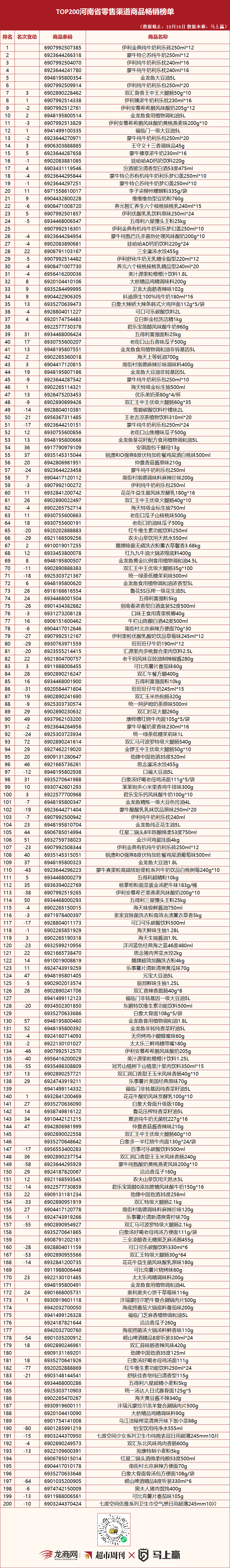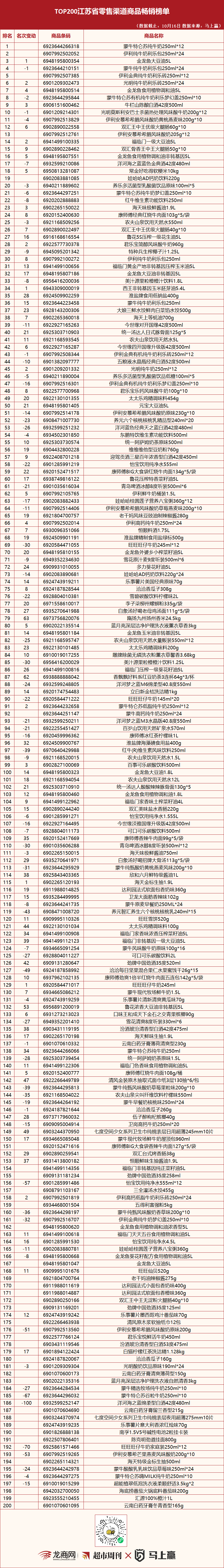 1.本期江苏更新26品,更新13%;河南更新27品,更新13.5%。两地榜单中的相同单品共72品,占比36%,同为两地TOP10的4品:伊利金典纯牛奶利乐砖250ml*12、蒙牛特仑苏纯牛奶250ml*12、金龙鱼大豆油5L、金龙鱼食用植物调和油5L。