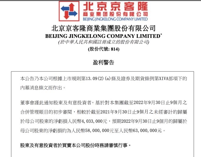 龙商网消息:10月24日,北京京客隆商业集团股份有限公司(以下简称“京客隆”)公告,预期截至2022年9月30日止9个月的归属于母公司股东的净亏损约为5800万元至6300万元。2021年9月30日止9个月归属于母公司股东的净亏损为403.3万元。