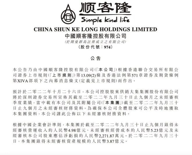 龙商网消息:10月25日,中国顺客隆公布的业绩公告显示,前三季度营收约4.98亿元(未经审核),经营成本约5.23亿元(未经审核),股东应占净亏损2271.87万元(未经审核),资产规模约3.87亿元(未经审核)。按此计算,中国顺客隆第三季度依旧亏损831.97万元,有扩大趋势。