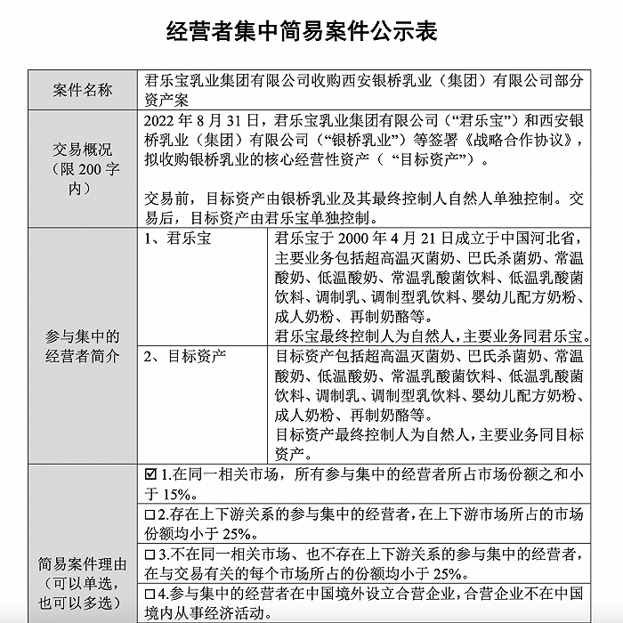 国家市场监管总局官网对君乐宝乳业集团有限公司(下称“君乐宝”)收购西安银桥乳业(集团)有限公司(下称“银桥乳业”)部分资产案进行了经营者集中简易案件公示。