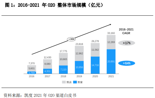 报告还指出,近年来,O2O整体市场规模持续扩容,在2021年超过3.3万亿元,其中到家业务近5年增速为64%,是O2O市场增长的内在动力。而即时零售作为O2O到家业务的重要组成部分增长显著,近5年市场规模增速达到81%,预计其未来对O2O到家业务的贡献率将持续提升,并有望拉动O2O整体市场规模的增长。