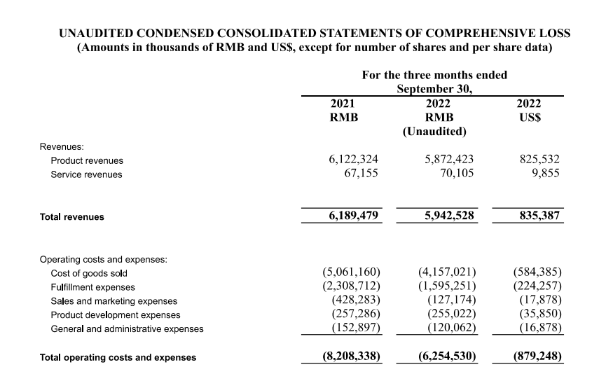 龙商网消息:11月11日,叮咚买菜发布了截至9月30日的2022年第三季度财报财报显示,叮咚买菜第三总营收为59.425亿元,与2021年同期的61.895亿元相比下滑4%。净亏损3.449亿元,而2021年同期净亏损为20.106亿元。不按美国通用会计准则(Non-GAAP),净亏损2.852亿元,同比下降85.6%;每股基本和摊薄亏损均为1.07元。第三季度,叮咚买菜GMV为65.120亿元,与2021年同期的70.185亿元相比下滑7.2%;总运营成本和支出为62.545亿元,较2021年同期的82.083亿元下滑23.8%;产品收入为58.724亿元,比2021年同期的61.223亿元下降4.1%。