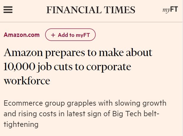 龙商网消息:有媒体报道称,亚马逊计划最早从本周开始大裁员,约1万名企业员工和技术岗位员工将受到波及。